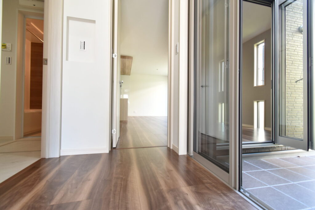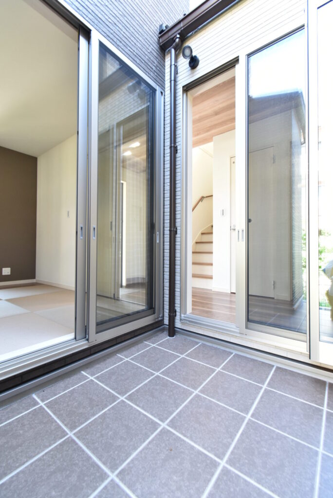 リビング前からテラスへのルート。お庭で遊び、テラスを通りお風呂場まで行くことができます。夏場の水遊び後の着替えや入浴は、このルートがあることでスムーズに行えそうですね♪