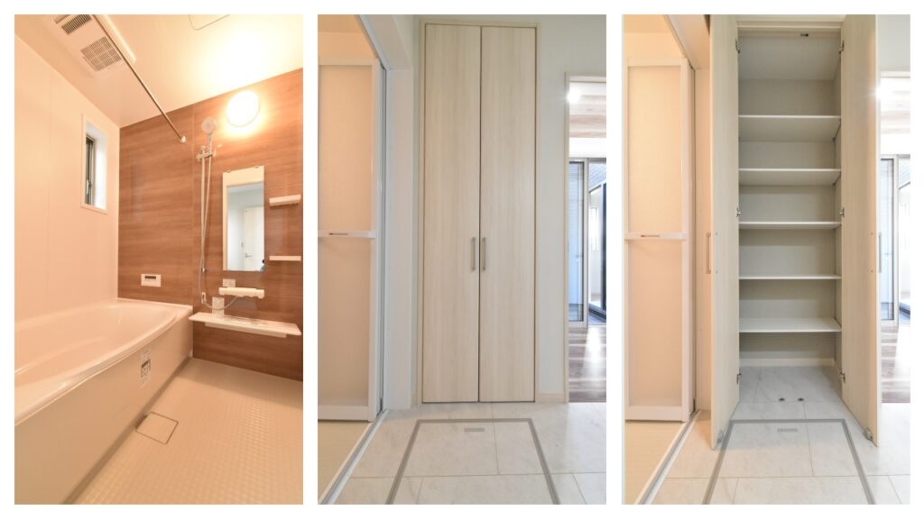 浴室入口手前には、可動棚付き収納がありました。入浴の際に必要な、着替えやタオル類・シャンプー類ストック置きに便利です。
