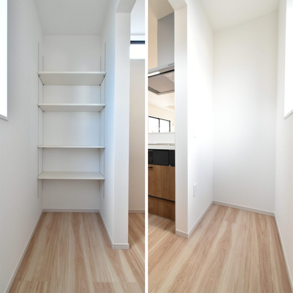 キッチン隣にあったのは、あったら嬉しすぎるパントリーでした!/左・可動棚が備え付けてあるので、調味料や食品のストックをすっきりと収めことができます。スペースには奥行きがあったので、お米やケース買いした飲料も収まります。右・/反対側のスペースには、コンセントがあったので、掃除機を充電しながら収めておくことができますよ。上に棚などを設置すれば、更に収納力が上がりそう♪