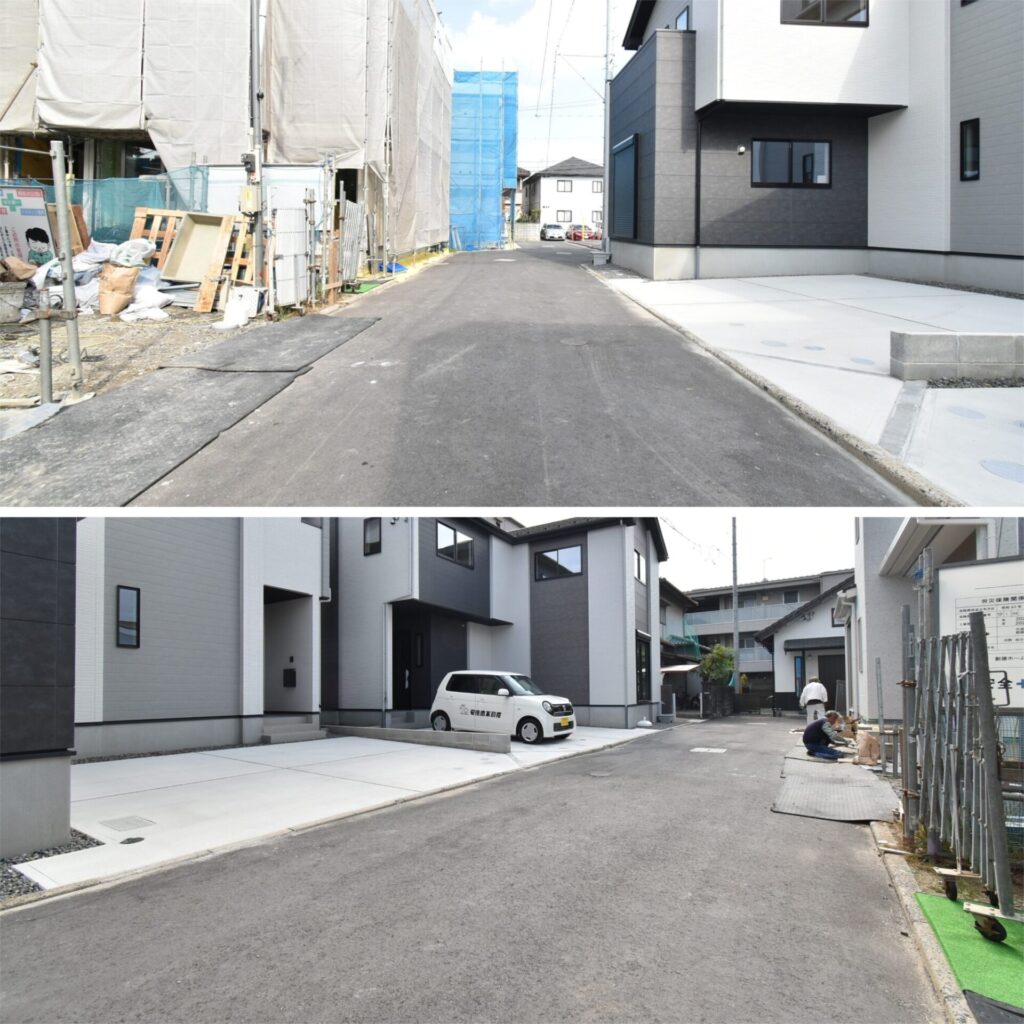 前面道路は、北西約4m。私道なので車の往来もなく、駐車しやすかったです。