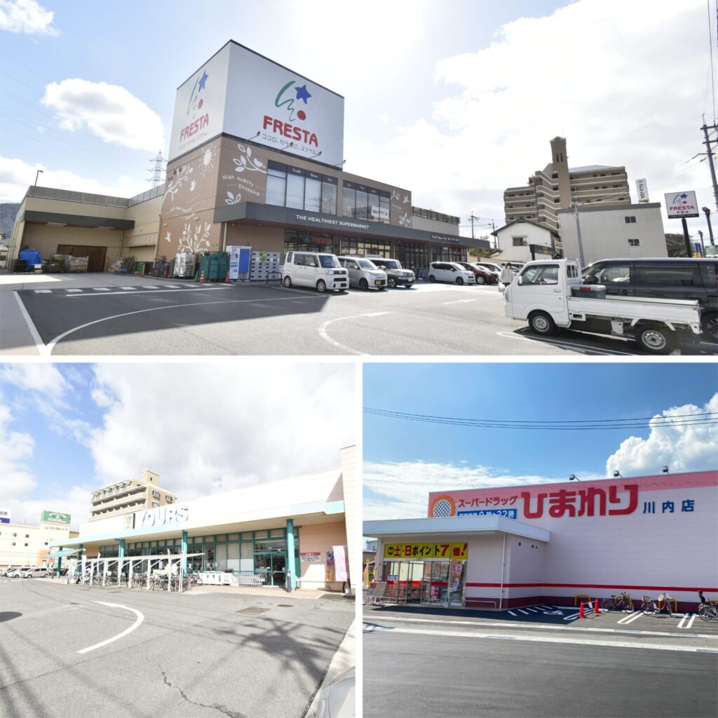 物件の近くには、「フレスタ中筋店」(約350m 徒歩5分)や「ユアーズ中筋店」(約550m 徒歩7分)などのスーパーや、「スーパードラッグひまわり川内店」(約500m 徒歩7分)が揃っています。日々の生活の利便性もGood!な環境ですね。
