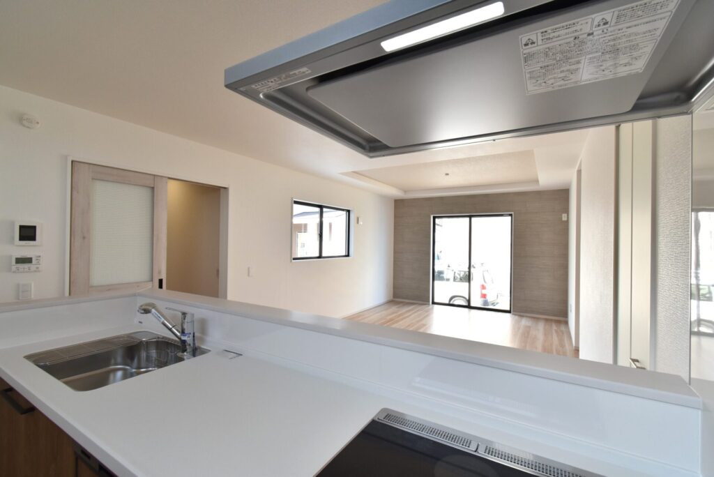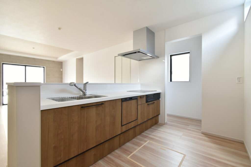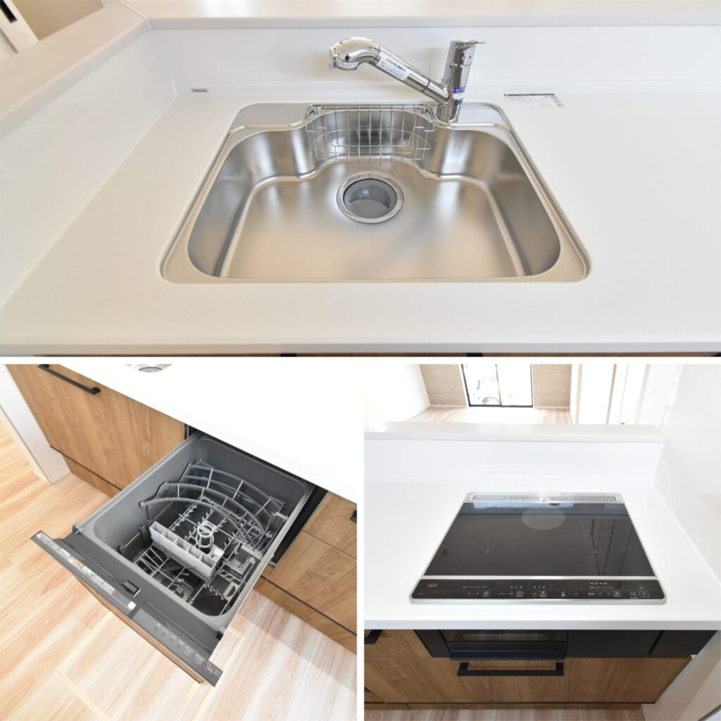 上・新築でしか味わえないピッカピカのシンク!シンク横には、水切りカゴを置くスペースもありました。/左下・食器を洗浄から乾燥までお任せできる食洗機。毎日の家事がと~ってもラクになります。/右下・コンロはIHコンロ!入居時にコンロ前にある排気口に、カバーを設置しておけば、油よごれやホコリの侵入を最小限にとどめることができるのでオススメです!