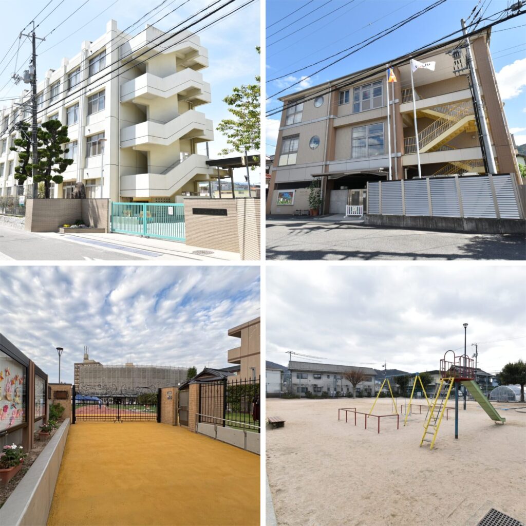 左上・小学校区は「川内小学校」(約1.2km 徒歩15分)/右上・0歳~1歳の子供たちは、元気な声が響き渡る「フレンズちっちこども園」(約600m 徒歩8分)で、/左下・2歳~5歳までの子供たちは、広いグラウンドと大きな遊具のある「ほうりん東野こども園」(約550m 徒歩7分)で生活中。将来的には、東野こども園の敷地内に新園舎が立ち、0歳~5歳までの全園児が生活できるようになるようですよ。より賑やかで楽しい園になりそうですね♪/右下・物件から一番近い公園は、「川内第四公園」(約450m 徒歩6分)。敷地がとっても広いので、思いっきり走り回ったり、ボールを投げたり蹴ったりして遊ぶことができます。