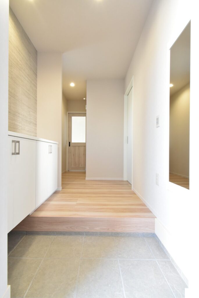 玄関は、白×グレー×ウッドの組み合わせで、明るく優しい雰囲気ですね。右の姿見近くには、コンセントがあったので、電動自転車のバッテリーの充電ができますよ。