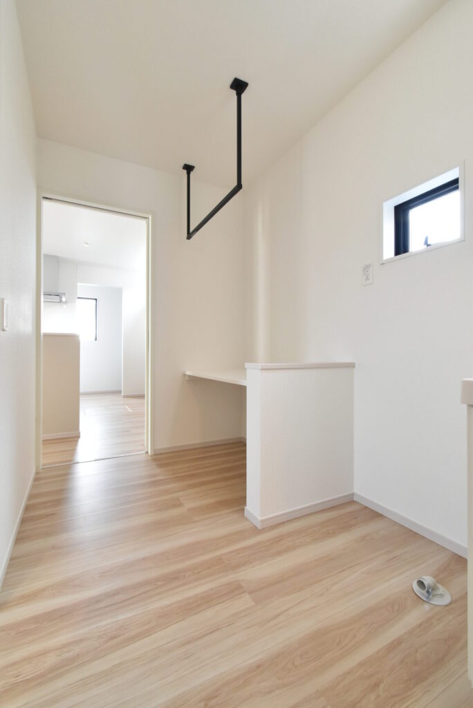 ランドリールームには、洗濯機置き場・洗面の他に、アイロンができるカウンターと、シャツなどを一旦干しておけるランドリーバーが備えつけてありました。カウンターとして利用する機会が少ない場合は、収納ケースをはめ込んで、部屋着やタオルなどの収納スペースにしてもいいですね。