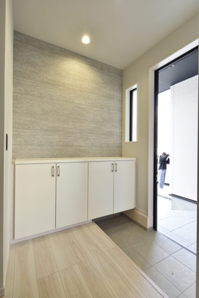 小さなお子さんでも、靴の出し入れがしやすい高さの靴箱。上部に収納ボックスがないので、玄関全体が明るくスッキリとした印象を受けました。