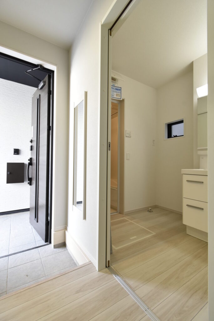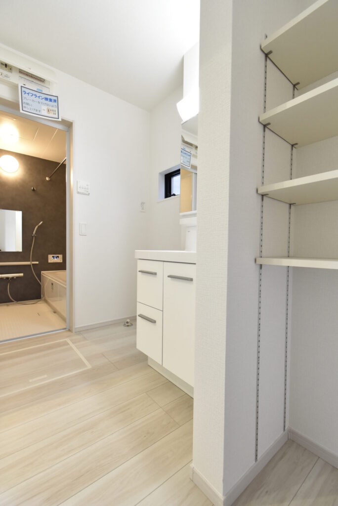 洗面横には、可動棚が備え付けられています。下着や着替え等を収納される際、ぜひお子さんがひとりで出し入れしやすい位置に一段棚を設けてみてください。「自分でやりたい!」の自己主張があった時に、そっと着替えを見守ってあげられそうですよ~。