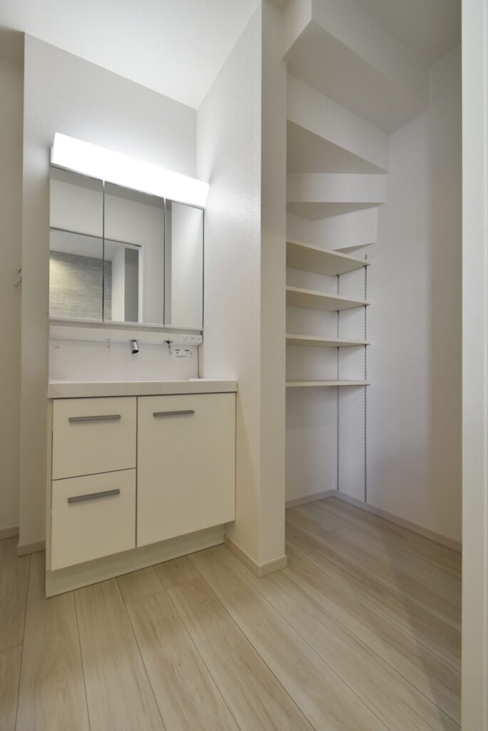 洗面台の左側は洗濯機置き場。衣類乾燥を洗濯機や浴室で仕上げたら、そのまま可動棚に下着やタオルを片付けられる動線。日々の洗濯家事が少しでもラクになるよう、洗面室にも住む人への優しさが詰まっていました。