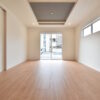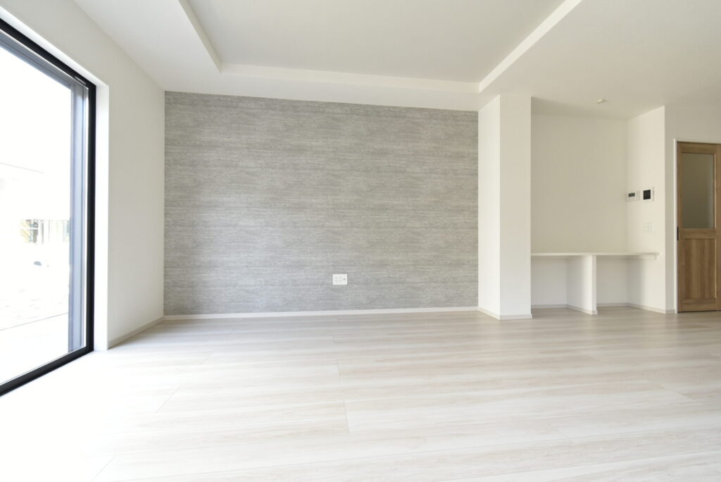 大型のテレビを正面に、ソファーからのアングルはこのような感じに♪広い壁面を使って、収納一体型のテレビ台を設置すると、収納も確保できリビングがスッキリと整いそう。