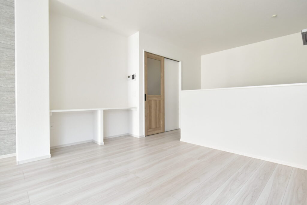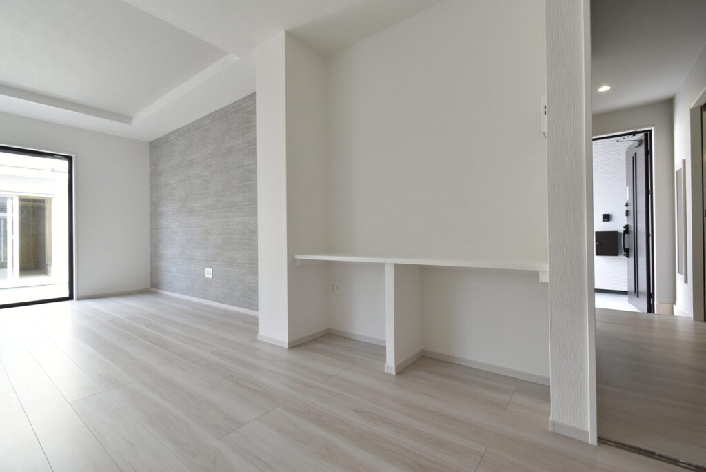 Wi-Fiルーターや携帯充電、家事の合間にサクッと家計簿記帳作業がしやすいカウンター。ゆくゆくは子供たちの宿題スペースにもなりそう。カウンター下には、引き出し収納やカバン置きボックスを作ると使いやすさがアップします。
