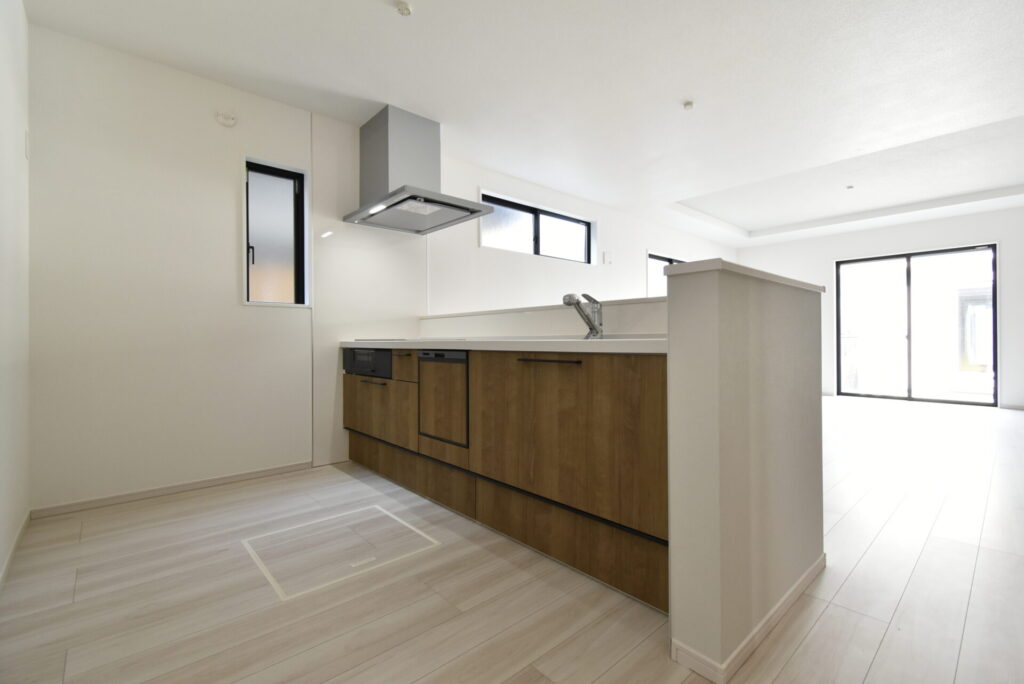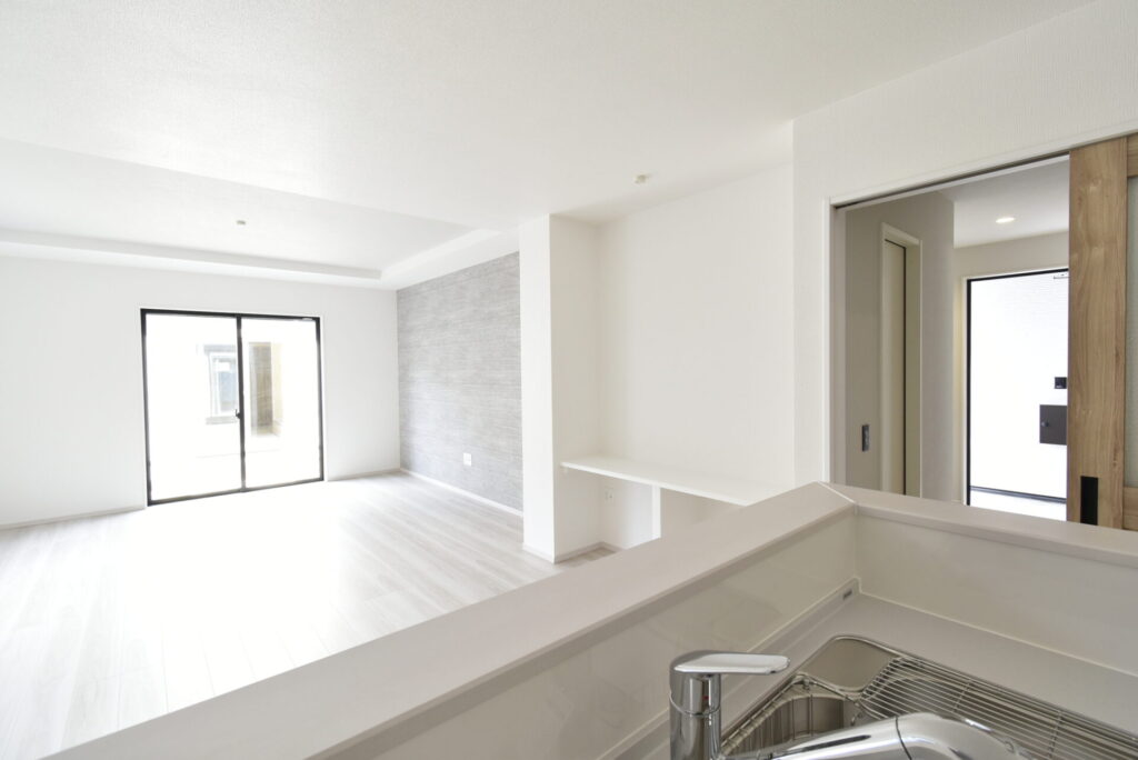 キッチンからは、リビングで過ごすお子さんの様子から玄関まで見渡せます。