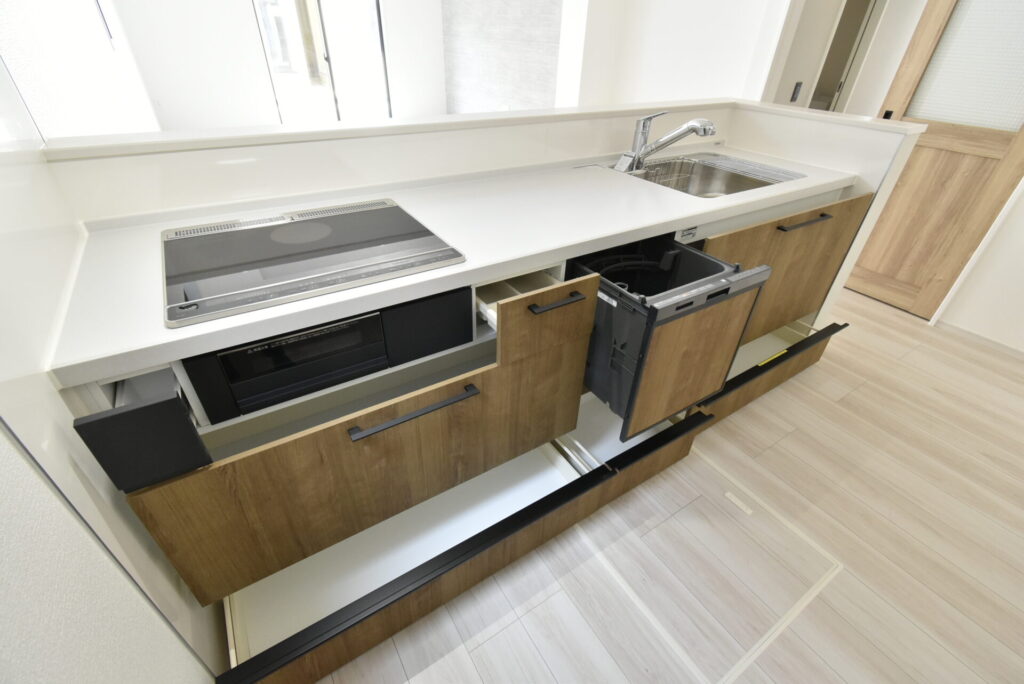 キッチンの設備は、IHクッキングヒーターに食洗機、そして無数の引き出し収納が備わっています。台所下収納には、ニトリの奥行き調整ができる整理ボックスがおススメ‼ぜひ、シンデレラフィットを体感してみてくださいね♪