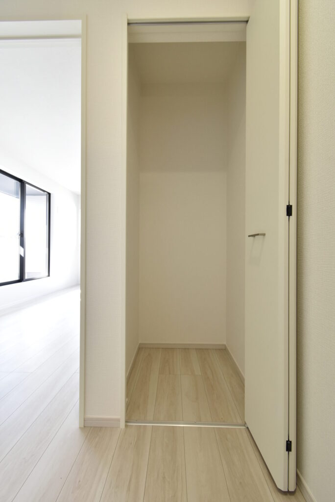 主寝室手前の廊下収納は、奥行きがあるので、扇風機・クリスマスツリー・スーツケースなどのかさばる物が収められます。高さのあるモノもどうぞ~。