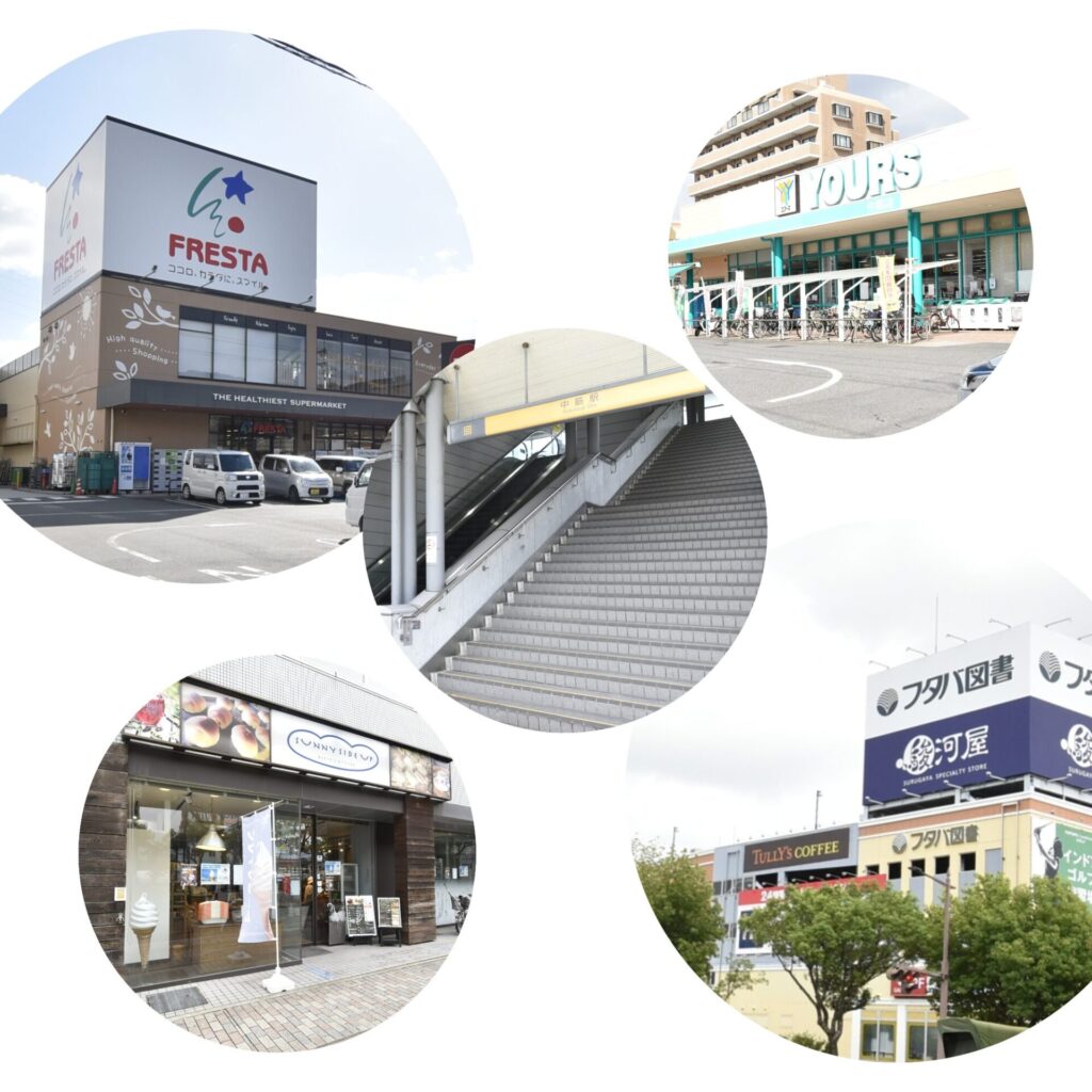 最寄り駅は、アストラムライン中筋駅。(徒歩 約13分)平坦な道のりなので、徒歩・自転車での移動がラクに行えます。駅周辺には、パン屋さんをはじめ、銀行・歯医者さん・皮膚科・お弁当屋さんにコンビニなど多数店舗が並んでいます。お家から徒歩5分の場所には、フレスタやフタバ図書まで。サクッと歩くとなんでも揃う環境なので、車を手放した後も安心して暮らせる、終の住処となりそうですね。