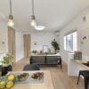 長方形のLDKは、奥行きがあり、開放感がありますね。ダイニングテーブルやソファーなど家具の配置がしやすいのも、長方形の良い所!また両サイドの壁面を広く使えるので、キャビネットを置くも良し・パネルや写真・絵を飾ることも行いやすい空間です。
