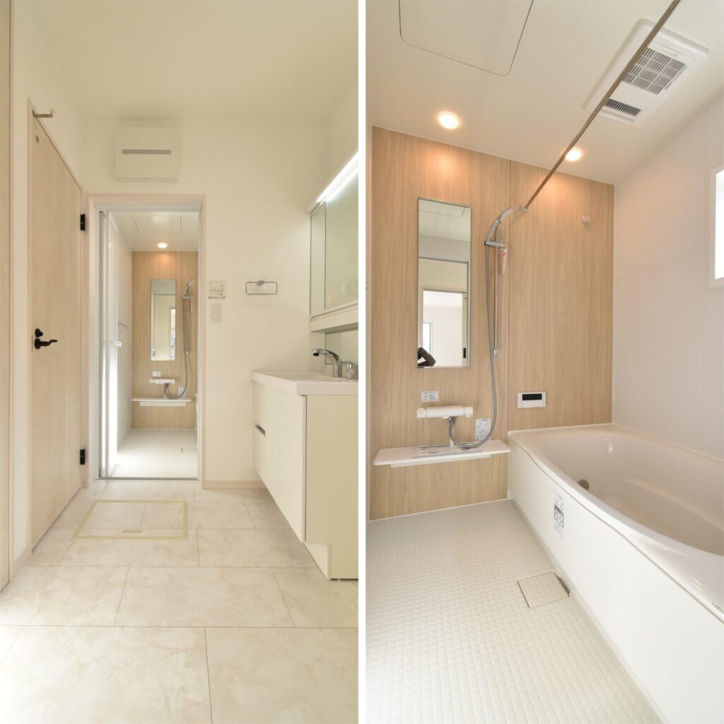 キッチン・洗面・浴室がまとまっているので、毎日の家事・掃除がはかどりますよ。浴室の壁は、マグネットがくっつく仕様で浮かせる収納が可能。水切れがよくなるので、お風呂掃除がちょっぴりラクになります。