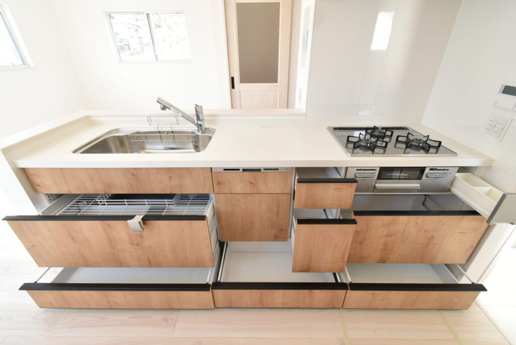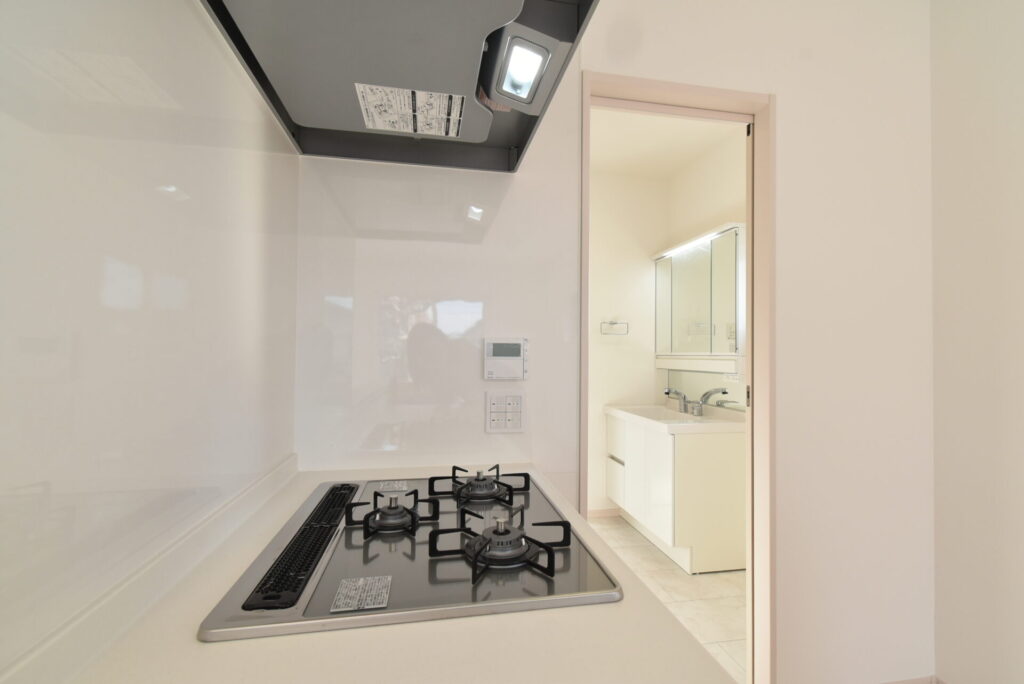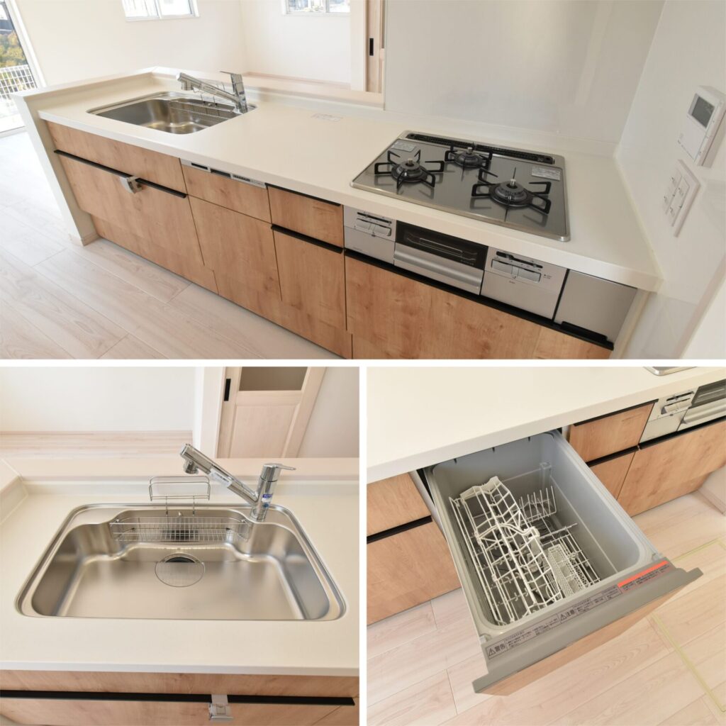 コンロは火力抜群のガスコンロ。ガスコンロは使用する調理器具に制限がないので、お気に入りの鍋やフライパンを選ぶことができます。作業スペースも広々としていて、料理がしやすそうでした。シンクは浄水器付きの水栓。作業スペース下には、家事の負担をグッと軽減してくれる、食洗機が備え付けてありました。