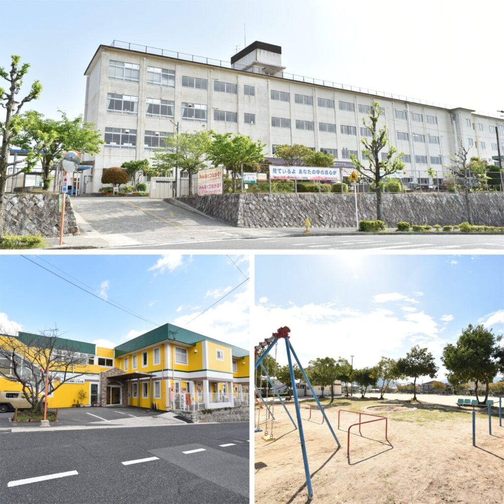 上・小学校区は「毘沙門台小学校」(約450m 徒歩6分)。/左下・季節ごとの行事も充実していて、子供たちが自由にのびのびと過ごせていると評判の「認定こども園サムエル信愛こどもの園」(約900m 徒歩12分)が物件から一番保育園です。/右下・ブランコ・すべり台などの遊具が揃う「毘沙門台北第一公園」(約130m 徒歩2分)。敷地が広いので、ボール遊びも思いっきり楽しめそう♪