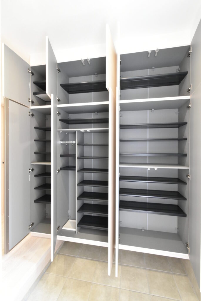 シューズボックスには、約50足の靴が収まります。普段使いする靴も、シーズンオフの靴もスッキリ収納することができます。傘を収めるスペースがあるのもGood!