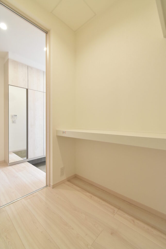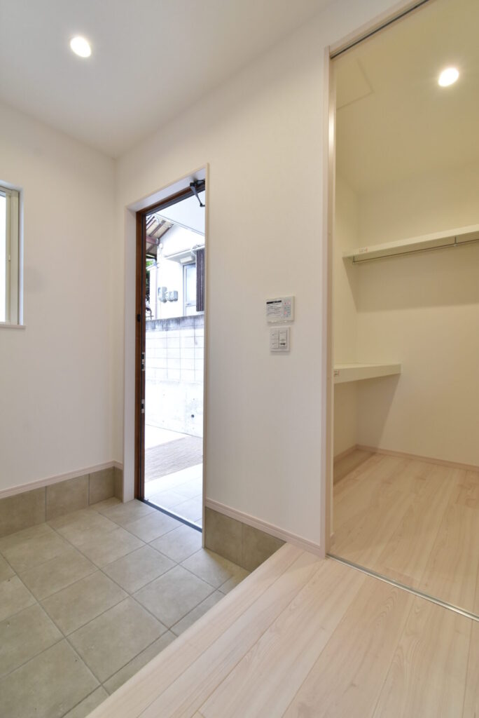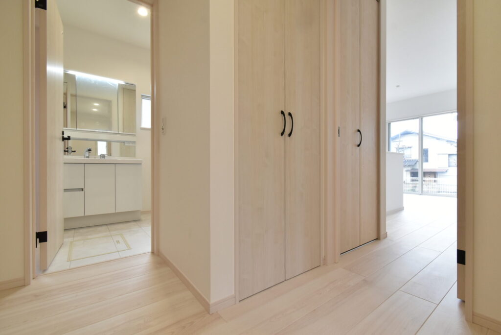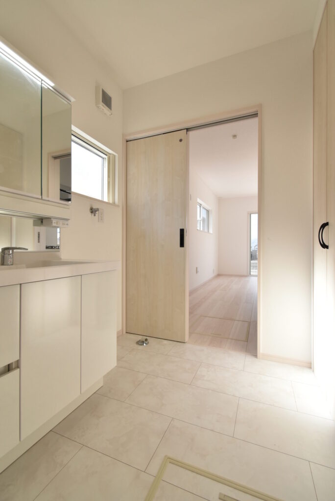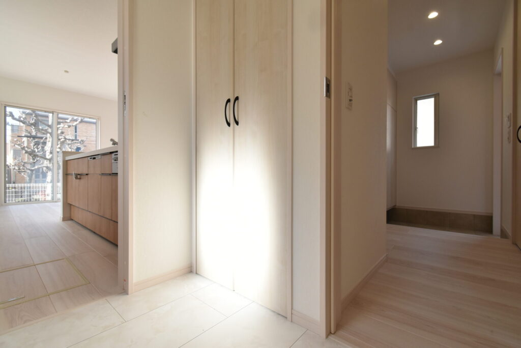 収納スペース隣にある戸を開けると、水回りと玄関を結ぶ動線が現れます。帰宅時この動線を通れば、手洗いがスムーズにできます。買い物帰りの重たい荷物を、一旦キッチンにドサッと置いておけるのも便利!