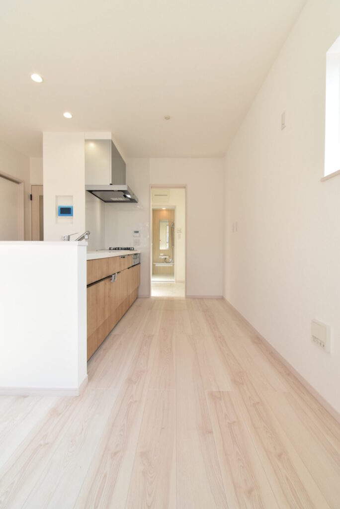 キッチンへ進んでみると、浴室まで真っすぐな動線が。更なる家事ラクを期待させますね~。