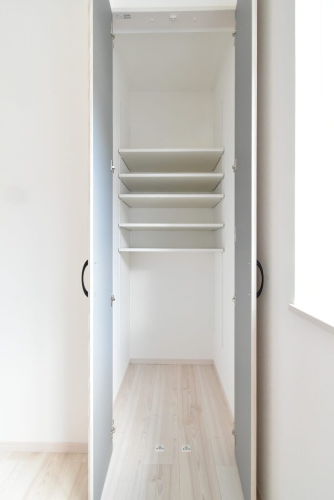 手前の収納スペースには、救急箱やトイレットペーパーなどの日用品を。奥の収納スペースはLDK内にあるので、園や学校で持ち帰る書類や、文房具など家族で共有するものを収納すると使い勝手がよさそう。