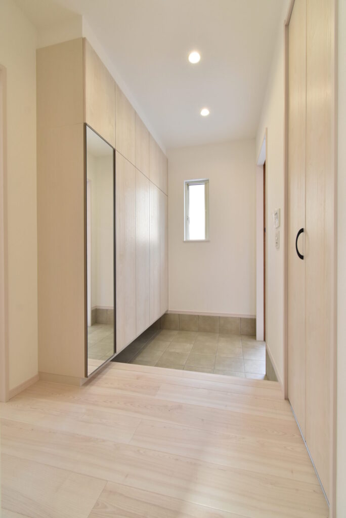 天井まで伸びる大きなシューズボックスが印象的な玄関。