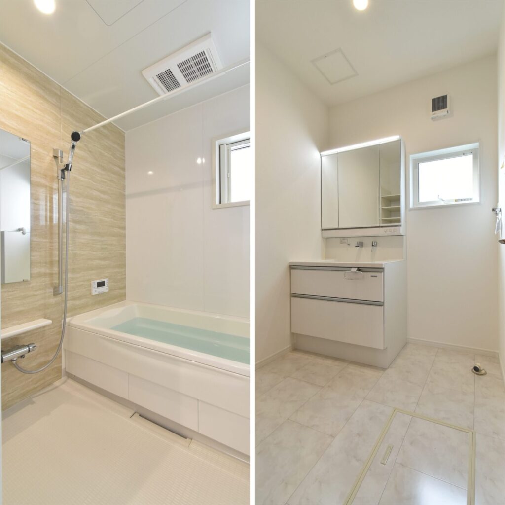 左・浴室乾燥機付きの浴室。浴室の壁は、浮かせる収納が可能なマグネット仕様でした。モノを浮かせると水滴が溜まりにくく、サッとお掃除もしやすいですよ。/右・洗面は、窓から陽が差し込み明るい印象でした。洗面の収納は、手前に引き出すタイプなので、奥の物も取り出しやすくGood!床には、シャンプーなどのストックを収めておける床下収納がありました。