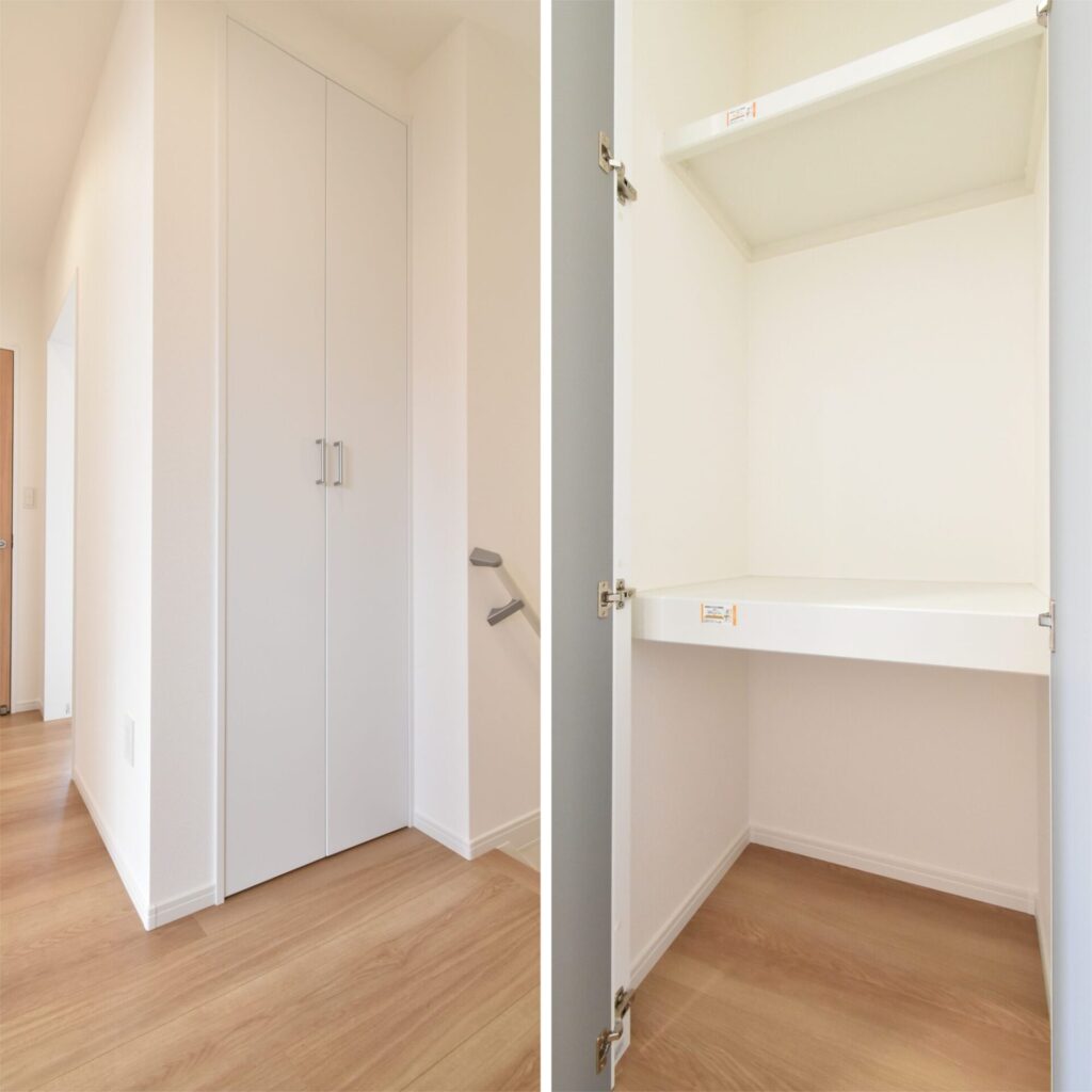 2階階段近くには、家族の布団などを収めておくのにぴったりな収納スペースも確保されていました。棚上には、コンセントがあったので、ルータも収めることができます。
