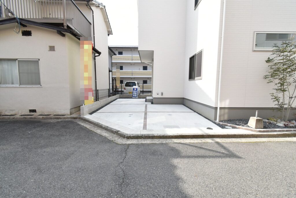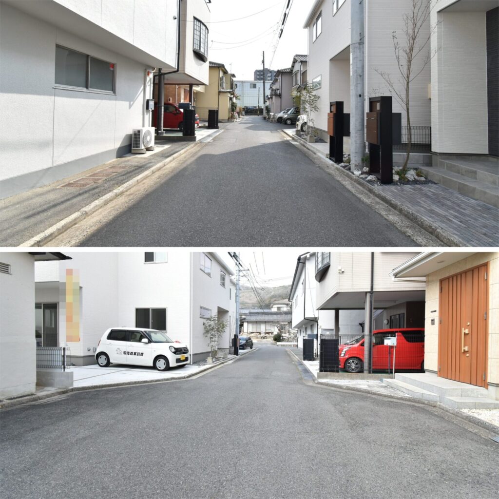 道路幅は北東4m。私道なので車の往来もなく、落ち着いて駐車をすることができます。