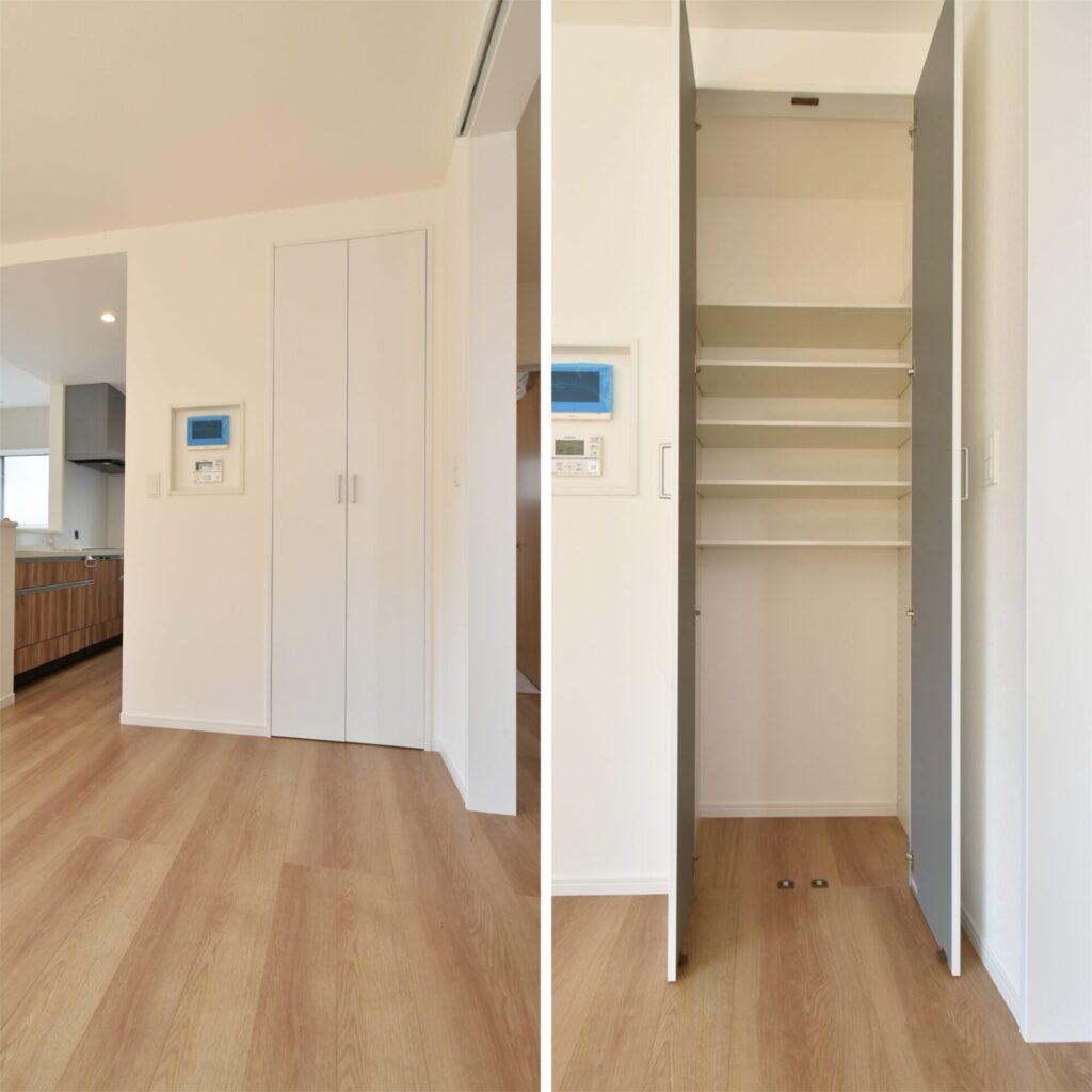 LDKには、書類や救急箱などを収めておける収納スペースもありました。可動棚の高さを調節し、無印の収納ケースをはめ込んで、美しく整った収納スペースにしたいですね~。収納が整っていると、家族もモノを定位置に戻す習慣がつきやすくなりますよ。