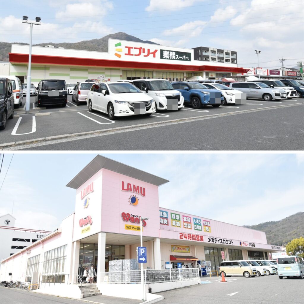物件から近いスーパーは、上・「エブリイ緑井店」(約600m 徒歩8分)と、/下・「ラムー八木店」(約650m 徒歩9分)。どちらのスーパーもお買い得の商品がたくさん並びます♪スーパー近辺には、ダイソーやユニクロ、飲食店などの店舗が豊富に揃っているので、お買い物が便利ですよ。