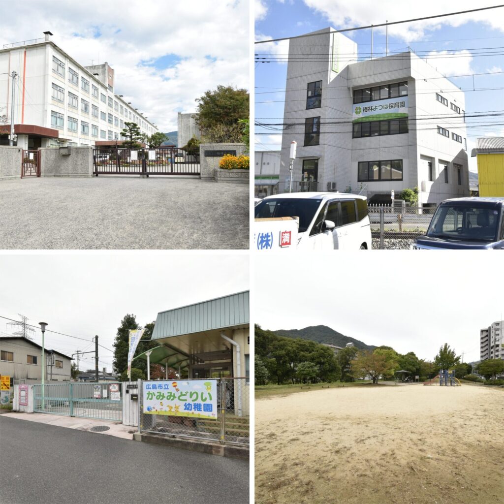 左上・小学校の学区は「梅林小学校」(約600m 徒歩8分)。/右上・物件近くには、「梅林よつば保育園」(約290m 徒歩4分)と、/左下・「上緑井幼稚園」(約120m 徒歩2分)があります。/右下・グラウンドの広い「緑井第6公園」(約240m 徒歩3分)が近いので、子供たちはボール遊びやすべり台などで思いっきり遊べますよ♪