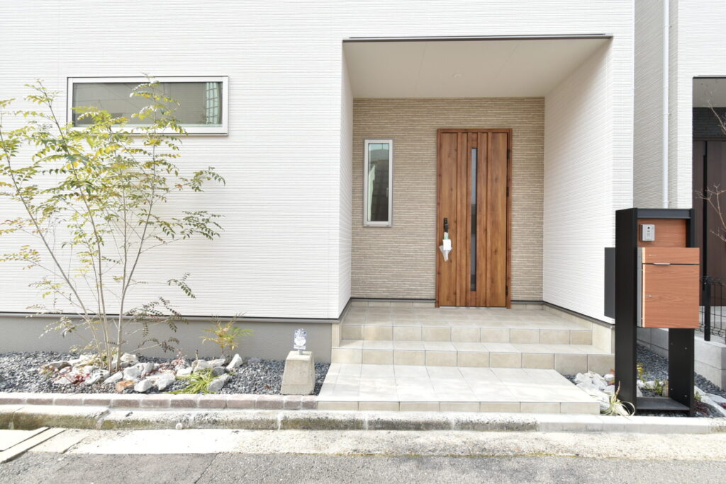 植栽が施されていて、いい雰囲気の玄関前。玄関ポーチの間口は広く、子供が隣りに並んでいても出入りがしやすそうでした。ドア上は屋根がしっかりかかっているので、雨の日も落ち着いて傘をさせますよ。ポストは宅配BOX付きです。