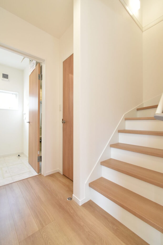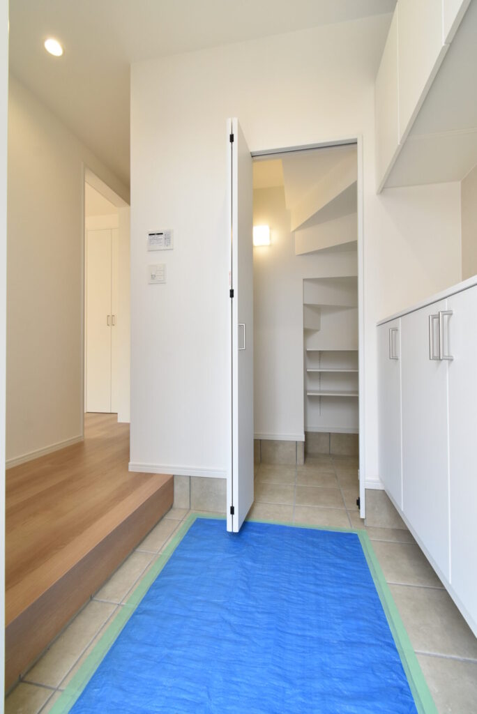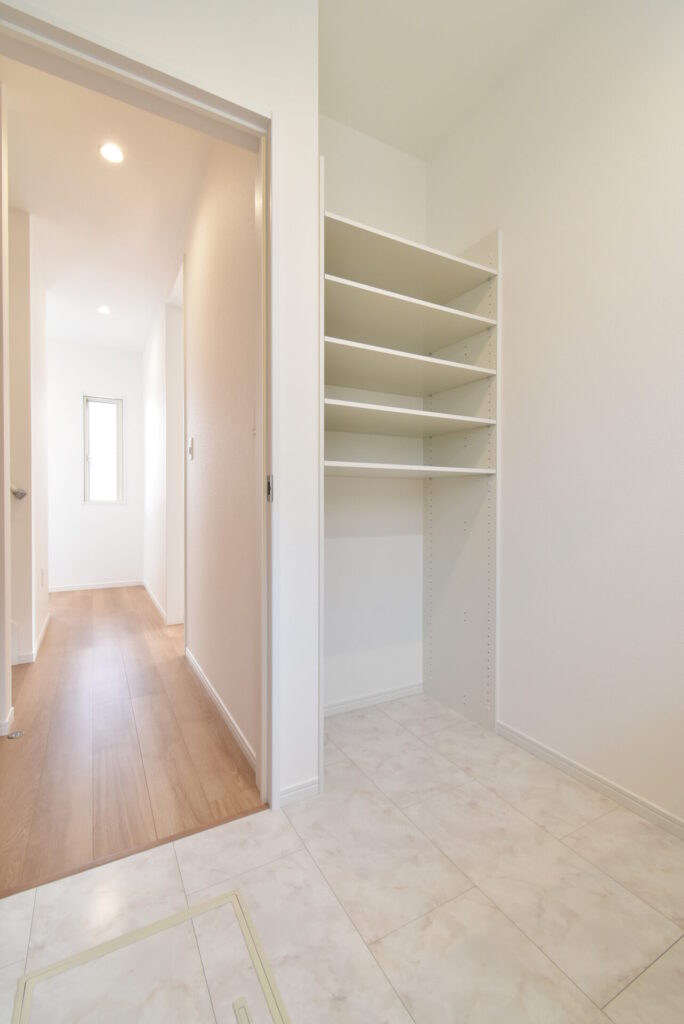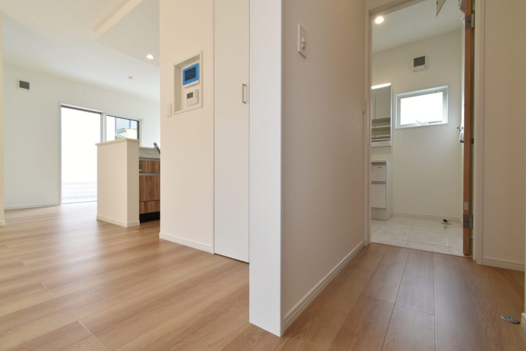 洗面の正面には、バスタオルや家族の下着を収めておけるスペースも完備です。ちなみに、左に見える通路をまっすぐ進むと玄関に到着します。