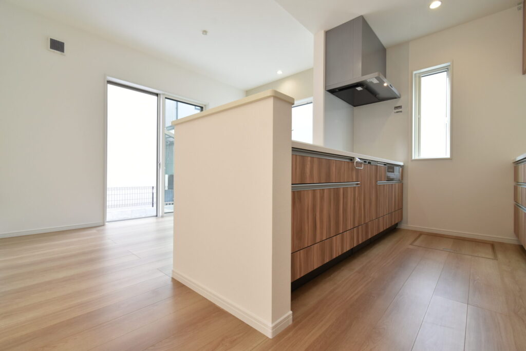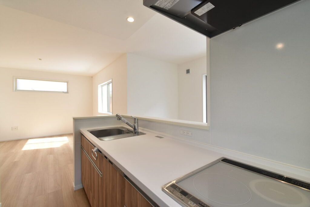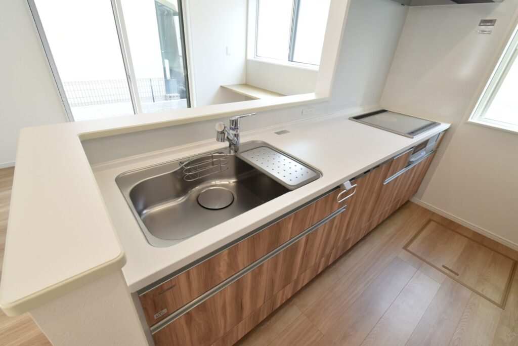 キッチンの立ち上がりの壁は、マグネットアイテムがぺたりとくっつく仕様に。シンクと作業スペースは広々なので、家事をちゃきちゃきと進めることができますよ~。作業スペースの正面には、ミキサーなどの調理家電が使いやすいコンセントを完備!更に作業スペースすぐ下には、家事の助っ人食洗機も待機しておりました!コンロはお掃除がラクラクなIHコンロです♪