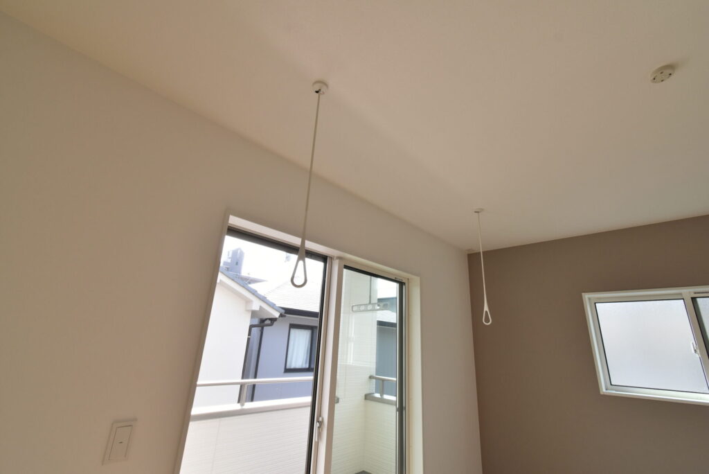 室内には、取り外し可能な洗濯物干しが備え付けられていました。花粉が多い時期や、洗濯物を取り込んで一旦どこかに掛けておきたい時に、大活躍してくれます。