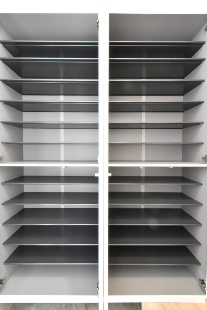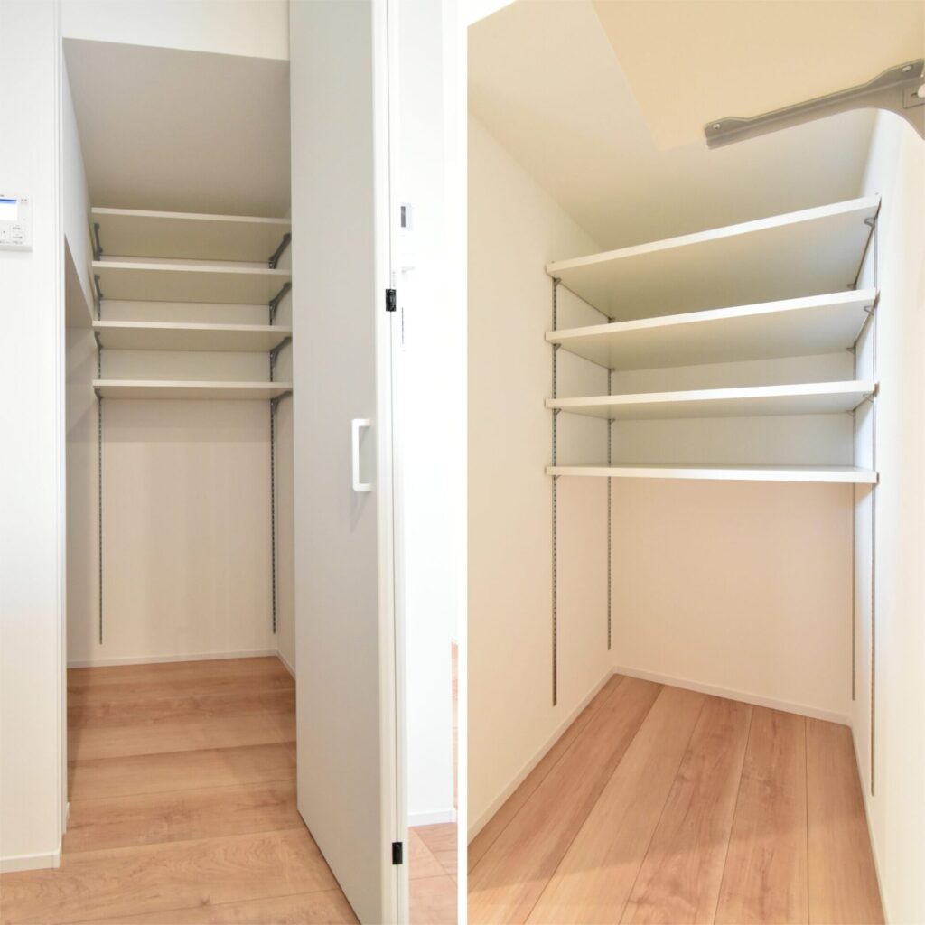 お次はパントリー!横にスペースが広がっているので、こちらも収納力抜群です。食品のストックやお米、箱買いしたペットボトル、キッチンペーパーやティッシュなどの日用品のストックも余裕で収まります。