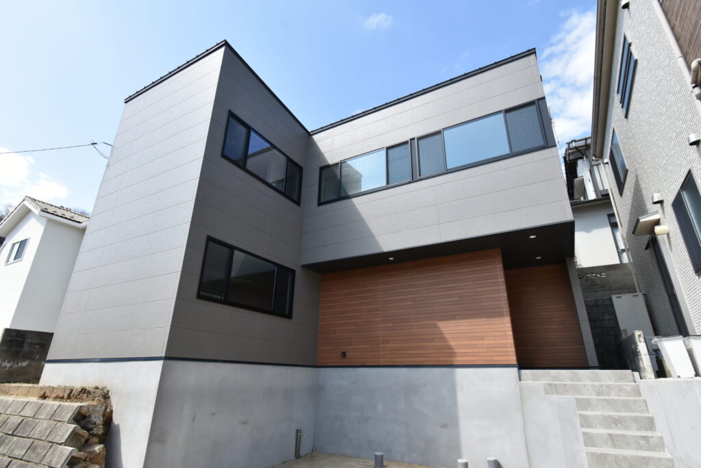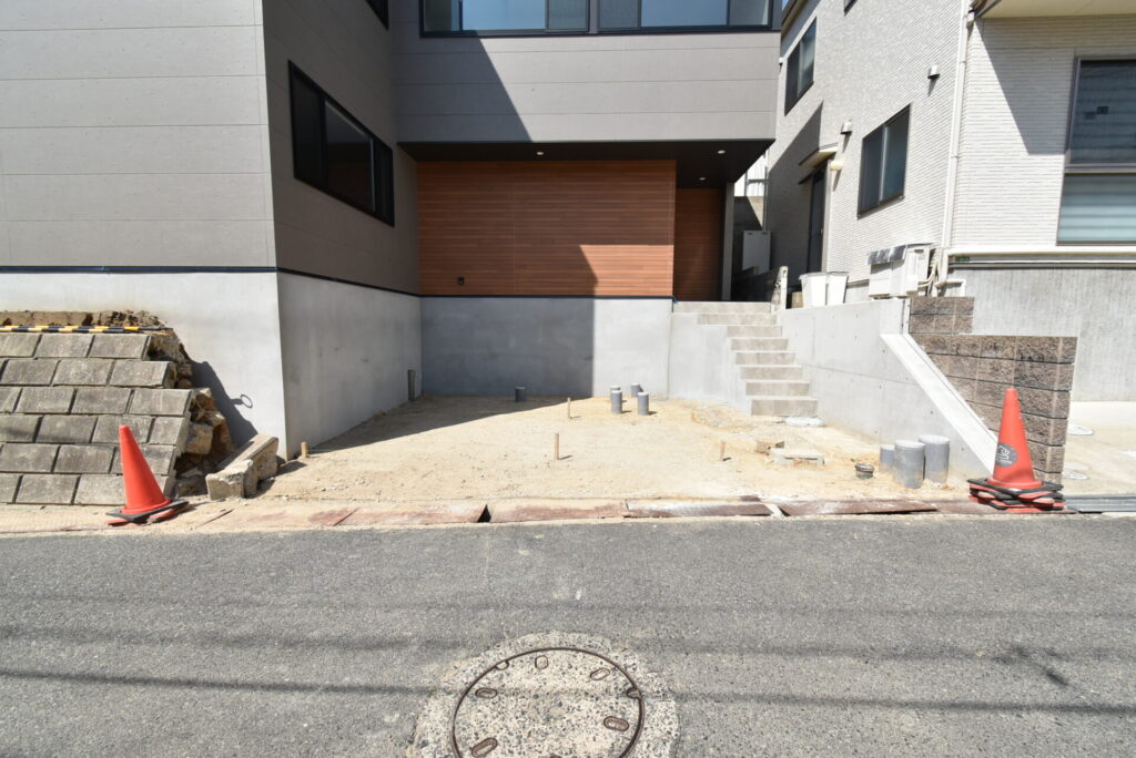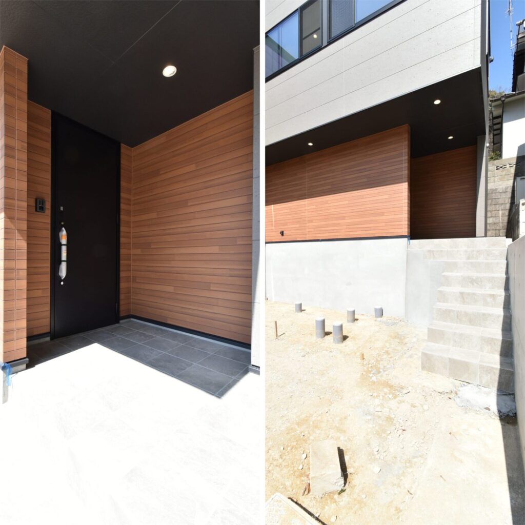 左・玄関前は、しっかりと屋根がかかっていたので、雨の日も落ち着いて傘をさすことができます。ウッド調の外壁もおしゃれでした♪/右・撮影時、外構はまだ施工途中でした。アプローチの階段は少し高さがあったので、安全面と登りやすさの為にも、今後の外構工事で手すりがつくことを願います!!