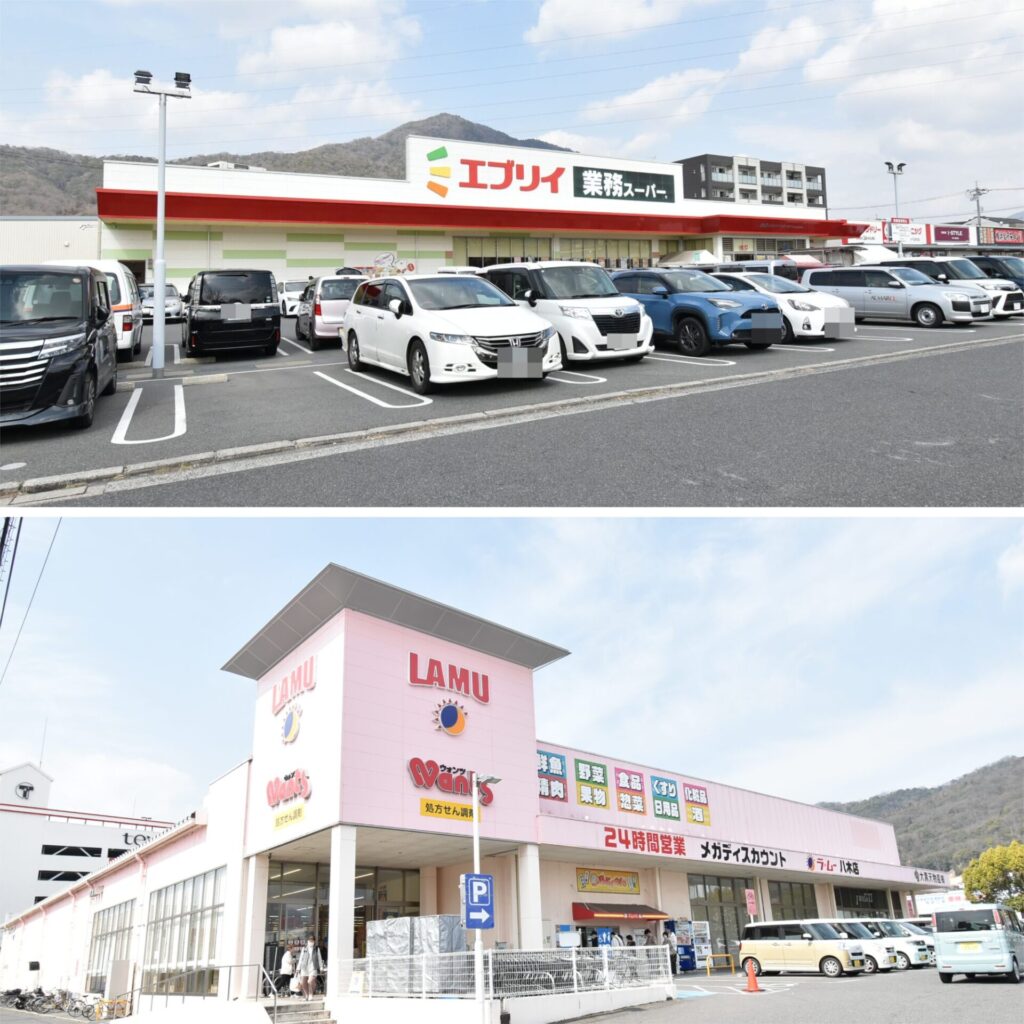 物件から近いスーパーは、上・「エブリイ緑井店」(約850m 徒歩11分・車4分)と、/下・「ラ・ムー八木店」(約900m 徒歩12分・車3分)。どちらもお買い得商品がたくさん並ぶ、家計に優しいスーパーです。ラ・ムーにはウォンツが入っているので、日用品の買い物も一気に済ませることができますよ。