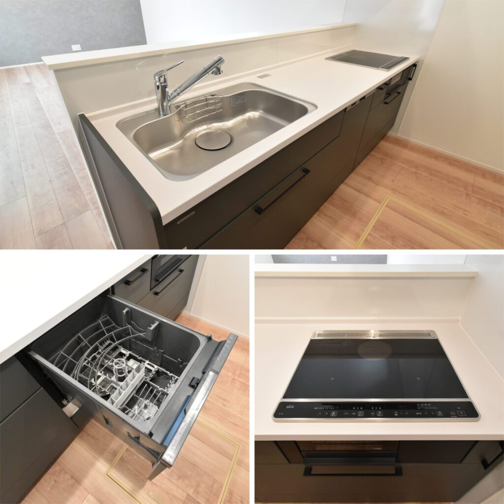 上・シンクも作業スペースも広々としたキッチン。子供と一緒に料理をするときも、窮屈さを感じることなく作業を進めることができます。キッチンの立ち上がりの壁は、マグネット仕様です。/左下・食器洗いの負担を軽減してくれる食洗機。高温で食器を洗浄乾燥してくれるので衛生的ですよ。/右下・コンロはIHコンロ。火を使わないので、火事やガス漏れの心配がいりません。