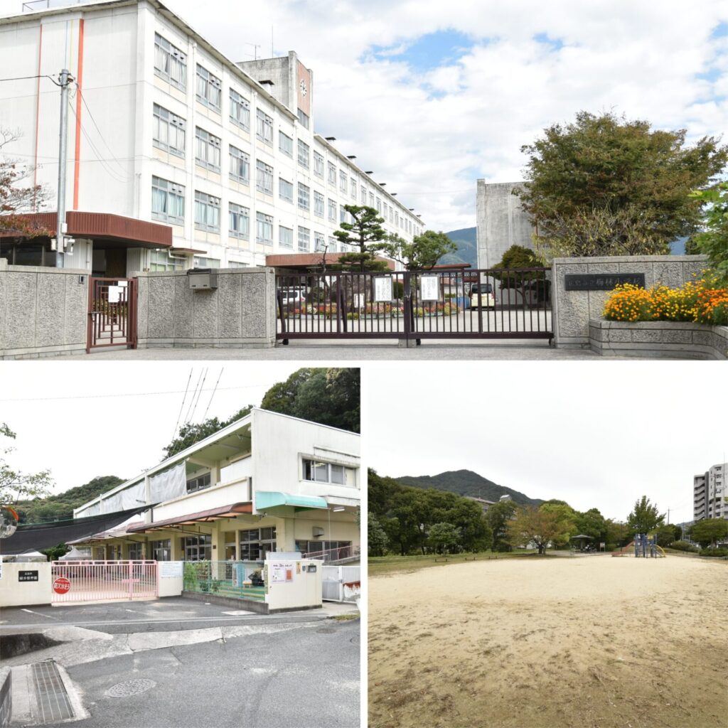 小学校区は、上・「梅林小学校」(約750m 徒歩10分)。/左下・物件のすぐ傍にある「緑井保育園」(約120m 徒歩2分)。送り迎えがとってもラクな距離感です。保育園の前を通ると、元気な子供たちの声が響きわたっていましたよ。/右下・物件から一番近い公園は、ボールや遊具遊びを思う存分楽しめる「緑井第六公園」(約750m 徒歩10分)です。