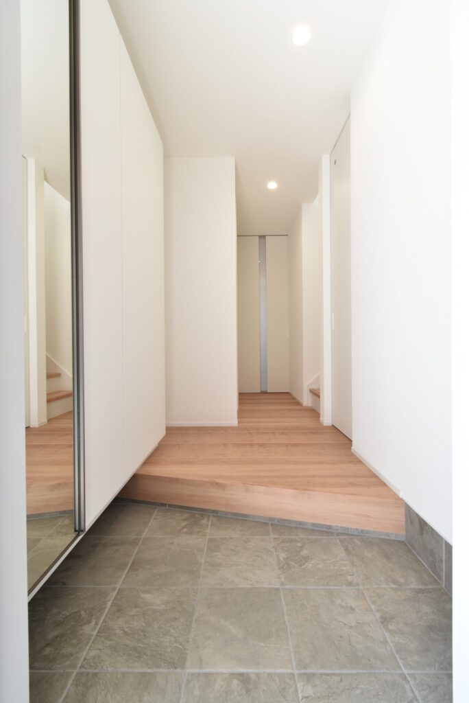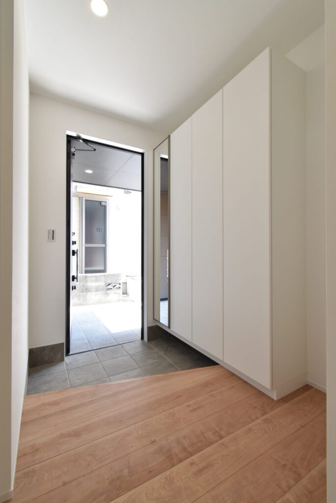 天井まで届きそうな、ホワイトのシューズボックスが印象的な玄関。外出する前に身だしなみをチェックできる姿見もついています。シューズボックス隣には、電動自転車の充電に役立ちそうなコンセントもありましたよ。