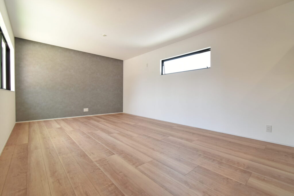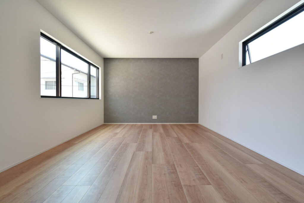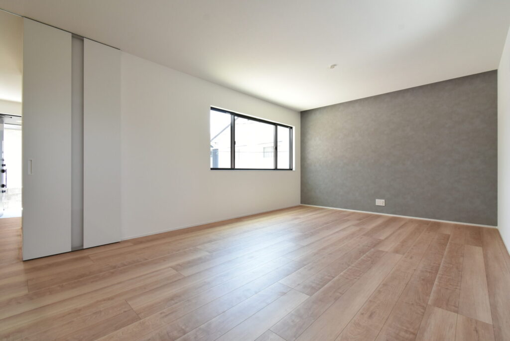 正面のアクセントウォール前にテレビ、その手前にソファを設置するイメージです。壁面が多いので、おもちゃ収納やキャビネットなどの家具が設置しやすそうでしたよ。