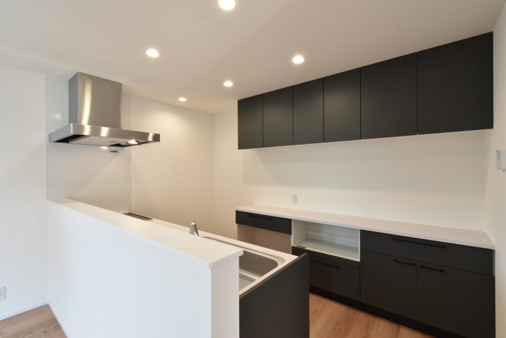 シンプルな空間をグッと引き締める、ブラックの背面収納がかっこいいキッチンスペース。シルバーのレンジフードもお洒落!