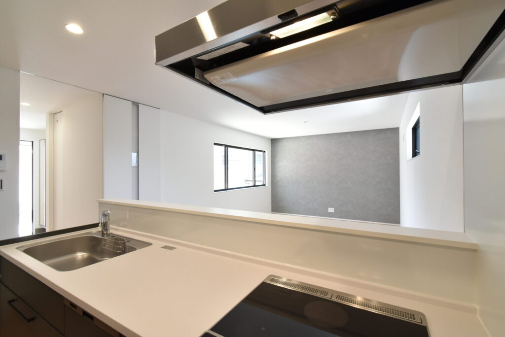 コンロ前に壁がないので、とっても開放感のあるVIEWです♪家族とコミュニケーションも取りやすく、お皿の受け渡しもラクに行えます。唐揚げやてんぷらが夕食のメニューの日は、油跳ねガードを使用すると、ダイニングへの油の飛び散りも防げますよ。