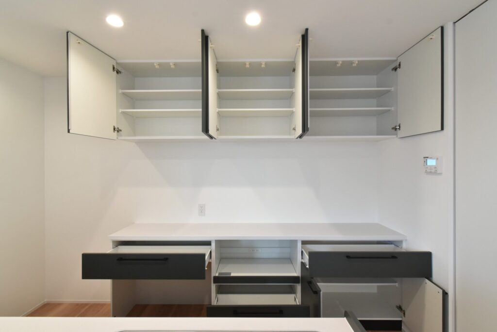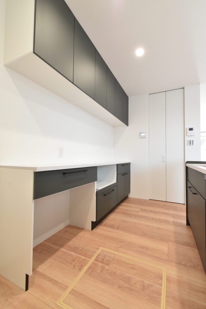 「かっこいいブラックの背面収納、収納力はどんな感じなんだろう・・」と気になりますよね。これからフルOPENいたしますので、ご覧ください♪キッチンにはパントリーもあったので、順番に見ていきましょう!