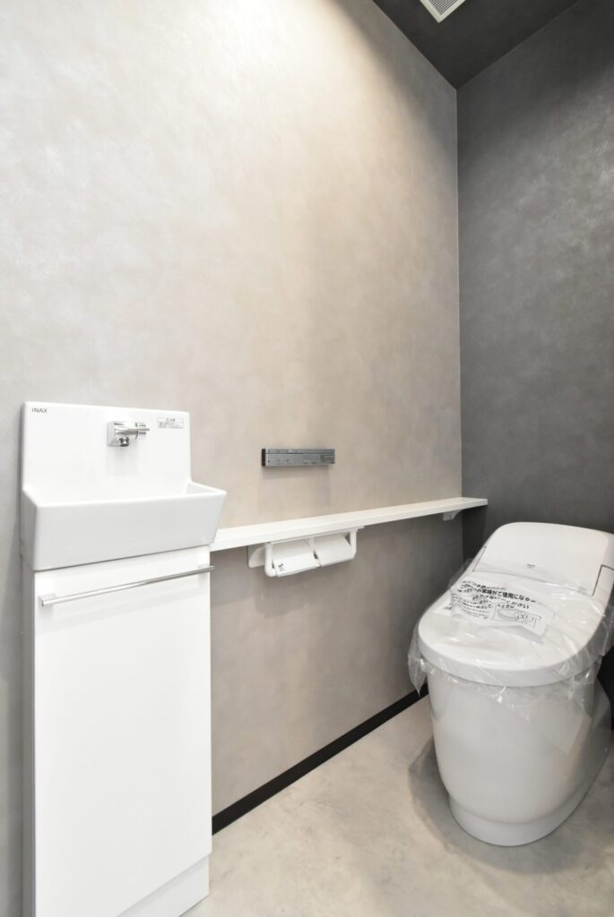 お手洗いもモダンな雰囲気でお洒落でした~。そしてなんと、トイレのフタは自動開閉式。フタに触れないで済むので衛生的です。水栓の下には、掃除道具をちょこんと収められるくらいのスペースがありました。