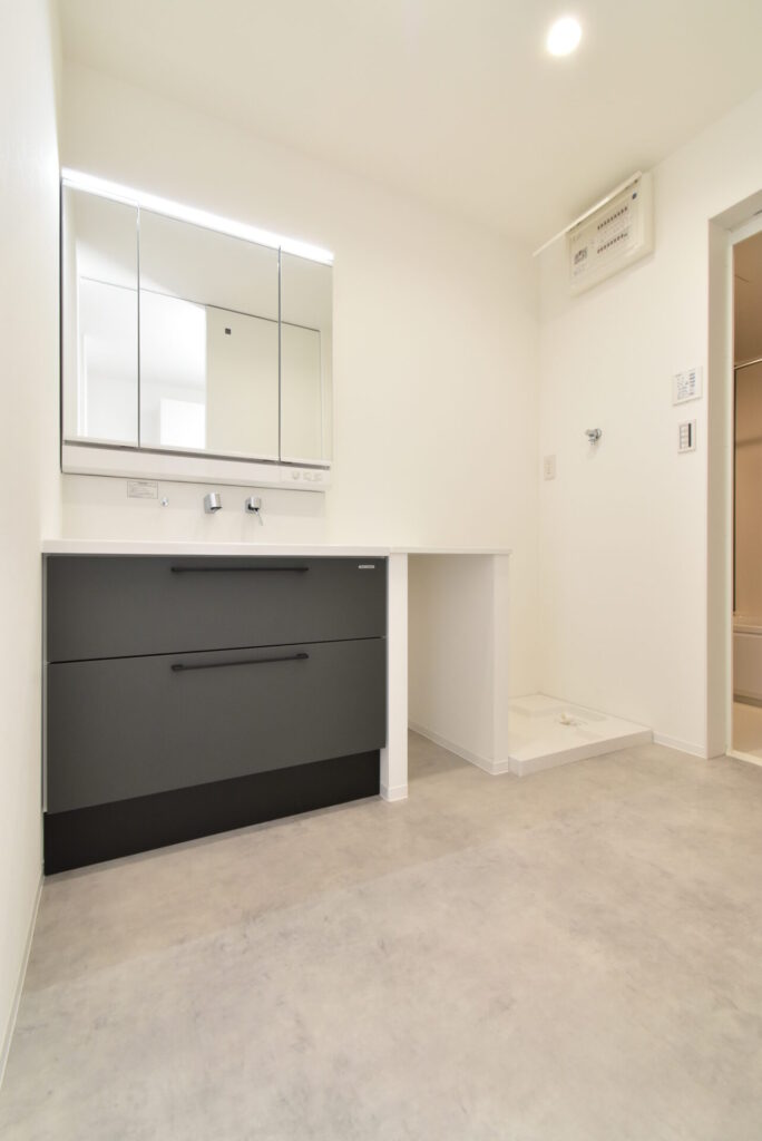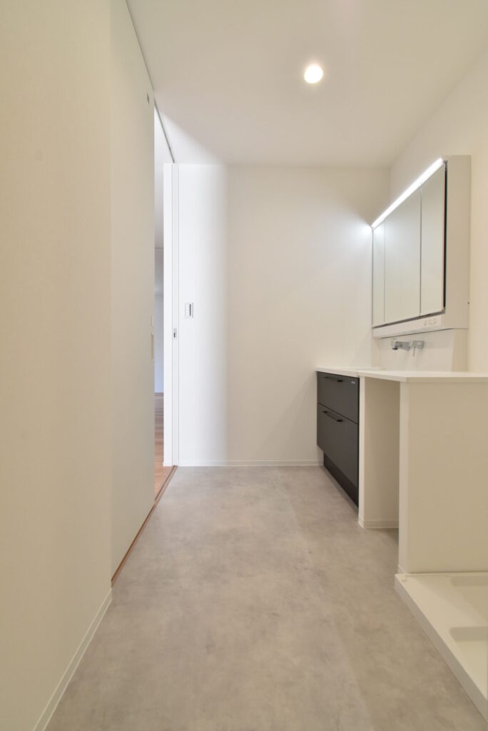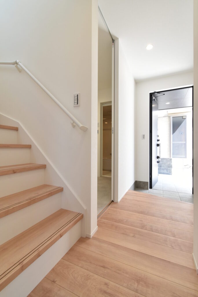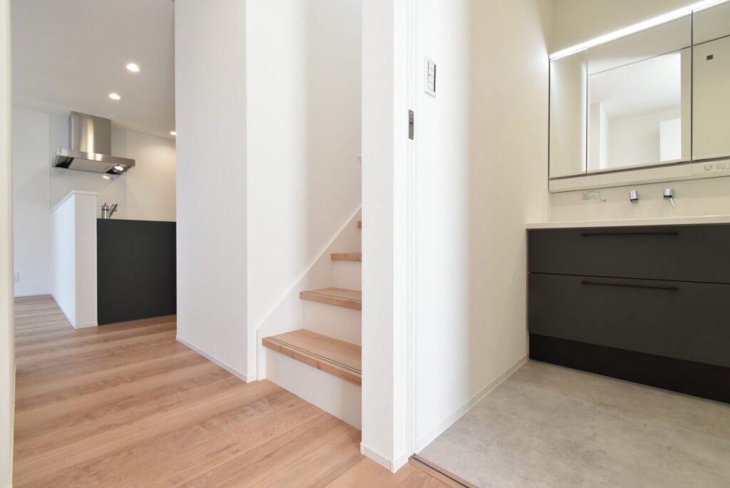 階段の隣りにチラリと見えるのが水回りスペースです。水回りは玄関とも近いため、帰宅時に手洗いをサッと行えます。