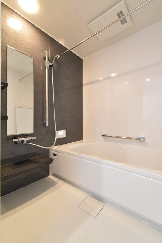 窓のない断熱性・気密性の高い浴室です。浴室には浴室乾燥機がついているので、冬場に暖房機能を使えば、とっても快適にお風呂時間を楽しむことができますよ。壁はマグネット仕様になっていたので、浮かせる収納が可能です。毎日のお掃除が少しラクになります。